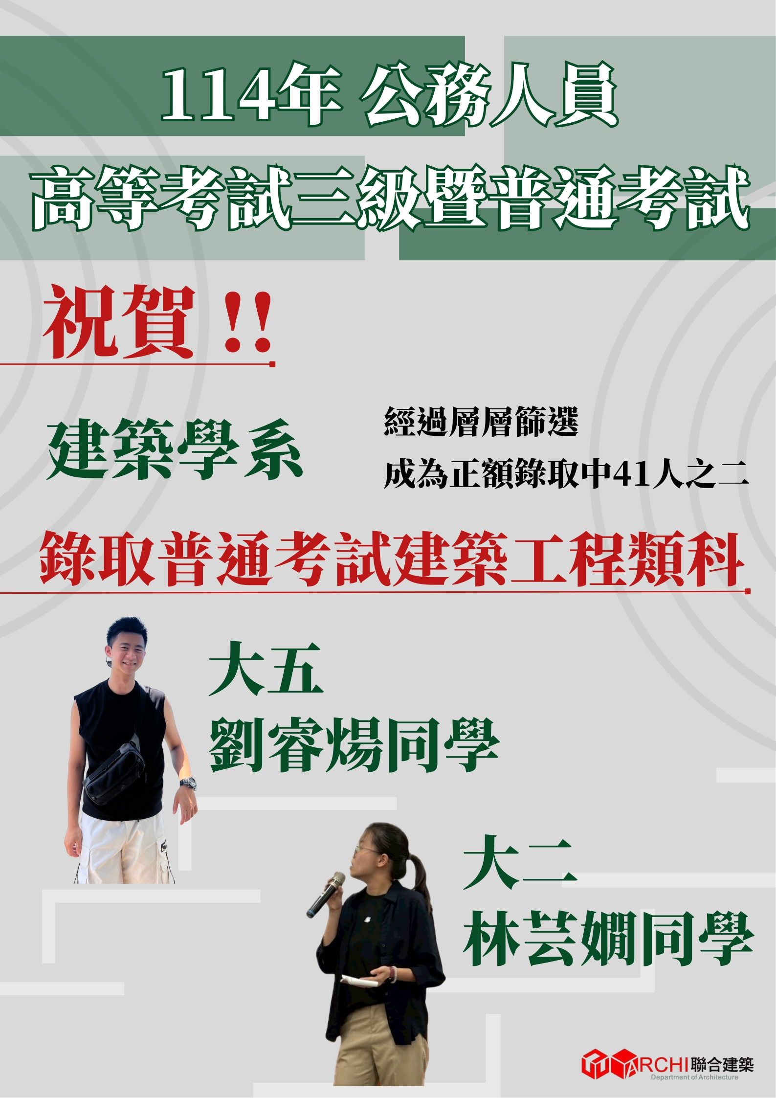 🎉🎉🎉 祝賀!🎉🎉🎉大五劉睿煬同學 大二林芸嫻同學 錄取普通考試建築工程類科